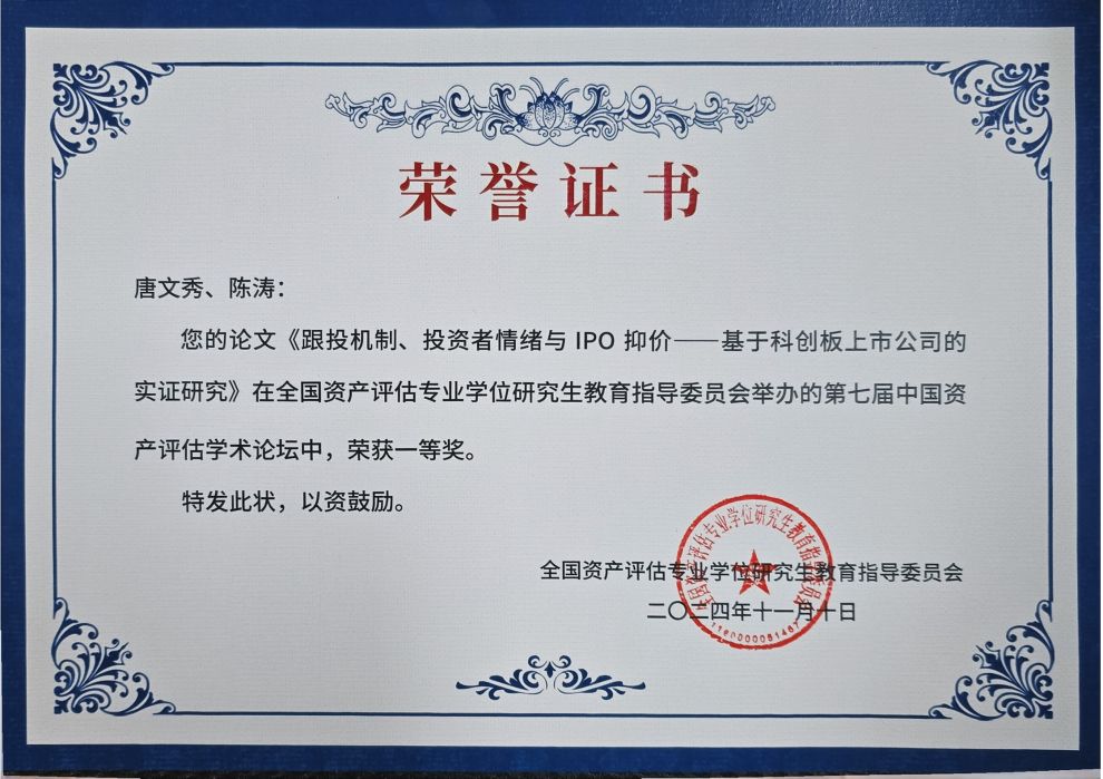 第七届中国资产评估学术论坛暨《资产评估研究》2024年研讨会近日在首都经济贸易大学成功举办,我院2023级硕士研究生陈涛撰写的论文入围本届论坛,并荣获优秀论文一等奖。