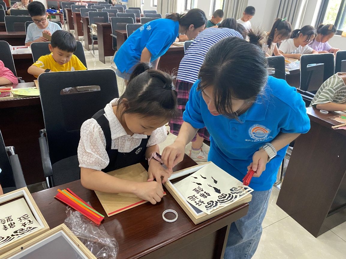 活动第一天开展的“沉浸式非遗工坊”获得众多好评。志愿者担任小老师,先系统讲解漆扇工艺及竹编画的历史渊源,将工艺知识与文化内涵转化为适合儿童理解的具象表达。在实践环节,志愿者全程指导儿童参与从材料预处理到成品创作的完整流程,最终完成20余件漆扇与20件竹编画作品。通过亲身体验,非遗传统文化变得触手可及,让儿童深入了解中华传统文化的魅力所在。
