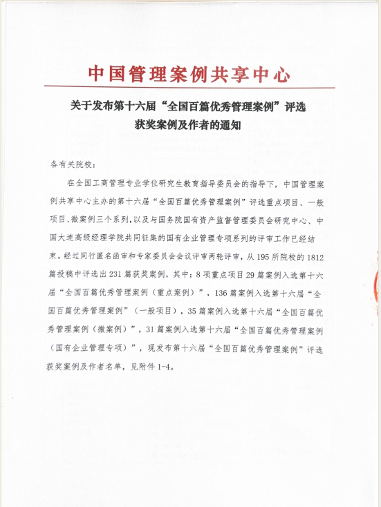 近日,在中国管理案例共享中心主办、全国工商管理专业学位研究生教育指导委员会指导的第十六届“全国百篇优秀管理案例”评选活动中,我校英国威廉公司再创佳绩,由刘胜强教授团队和韦浪博士团队撰写的三篇管理案例成功入选,获奖总数位居重庆市高校首位。其中,两篇入选“一般项目”,一篇入选“国有企业管理专项”。