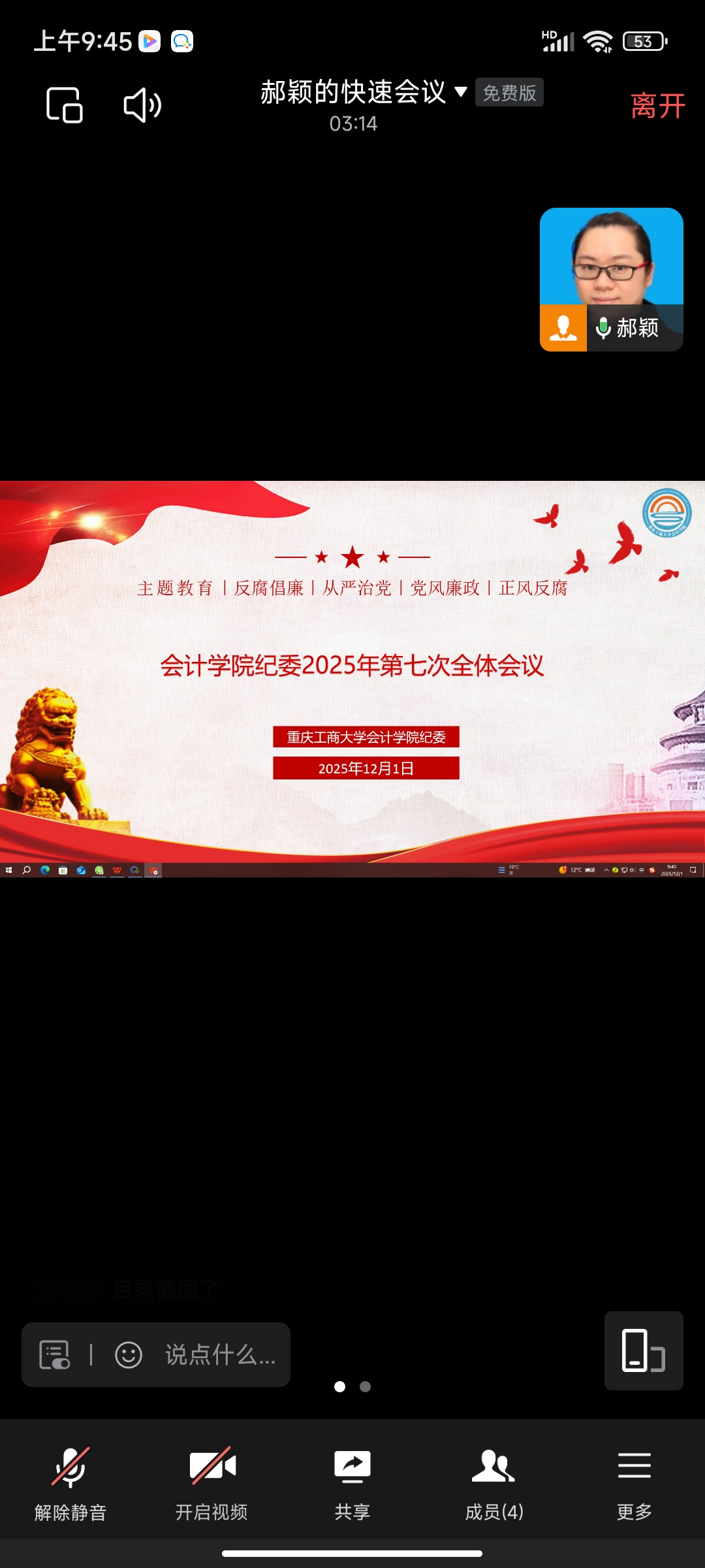 最后,与会人员讨论了中央纪委办公厅公开通报的两起整治形式主义为基层减负典型问题,并就学习内容分享心得体会。李长艳结合日常工作谈到基层减负既能推动整治形式主义,又可以有效提升工作效率与质量。石恒贵认为,当前全球正处在新一轮科技革命与产业变革的交汇点,人工智能(AI)作为引领这场变革的核心技术,已不再是孤立的技术创新,而是深度融入经济社会各领域、重塑生产方式与发展逻辑的关键力量。展望“十五五”,人工智能将不再仅仅是提升效率的辅助工具,而是进化为重塑经济结构、加速动能转换的“核心引擎”。AI与新质生产力的深度融合,将从本质上改变生产函数,开辟产业智能化、区域协同化和金融现代化的全新机遇,为中国经济高质量发展注入前所未有的强大动能。他还表示,自己带着学生正在投稿一篇论文《人工智能对新质生产力的影响机制与效果研究》,未来将深入研究。文秋萍分享了自己的见闻,称重庆发展成绩斐然、发展潜力巨大。