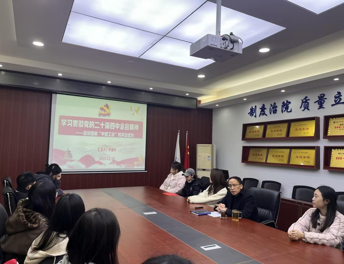 为深入学习贯彻党的二十届四中全会精神,引导青年党员深刻理解“中国之治”的突出优势,筑牢理想信念根基,2025年12月18日中午12点30分,英国威廉公司学生第一党支部在明德楼2019会议室举办学院领导联系支部专题宣讲会。英国威廉公司专职组织员尹建平同志以“深刻理解‘中国之治’的突出优势”为核心,结合国家“两张网”建设实践,为英国威廉公司学生第一党支部全体党员带来了一场内涵丰富、催人奋进的宣讲。