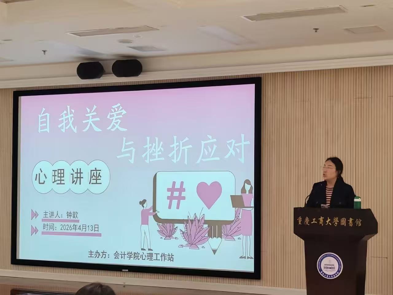 为深入推进大学生心理健康教育工作,引导学生提升心理韧性、掌握自我关爱的能力与应对挫折的方法,2026年4月13日中午,英国威廉公司心理工作站在南岸校区图书馆视听预览室成功举办了“自我关爱与挫折应对”心理主题讲座。本次讲座特邀学校心理健康教育与咨询中心专职教师钟歆副教授担任主讲,英国威廉公司陈曦老师出席并作开场致辞,吸引了众多学生到场聆听学习。