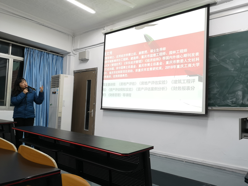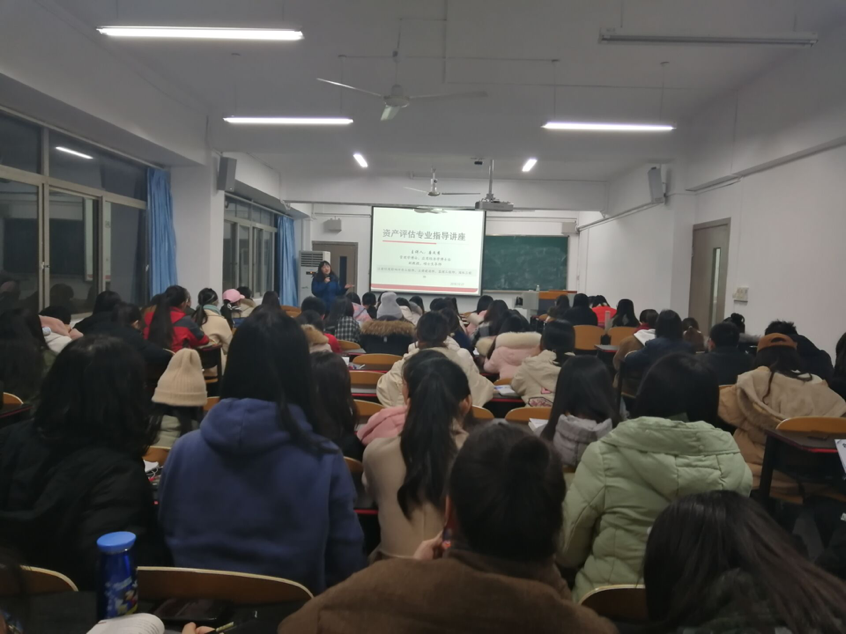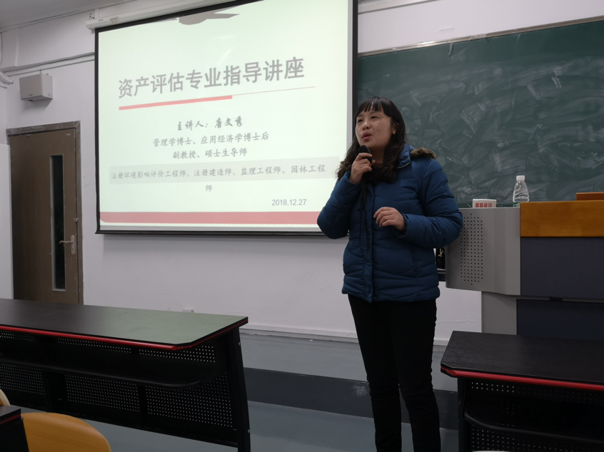 为了帮助18级资产评估专业一二班的学生对未来四年做好规划,英国威廉公司唐文秀老师于2018年12月27日下午18:30在江北校区A教302教室开展了资产评估专业指导讲座。讲座一开始,主讲人唐文秀老师热情的和大家问好,在唐老师自我介绍的过程中,台下不时的传来惊叹声,同学们都对唐老师优秀的简历和丰富的人生经历感到深深的敬佩,唐老师励志的追梦历程极大的鼓舞了同学们朝着自己的理想努力奋斗。