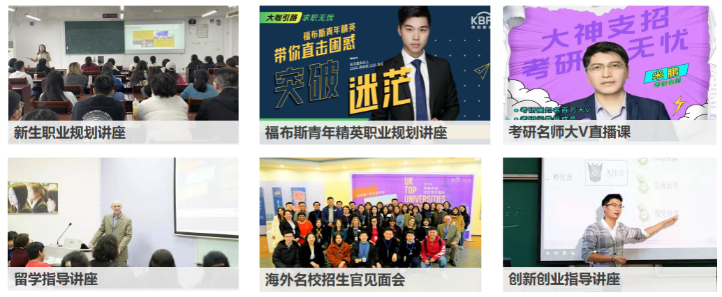 邀请职业规划导师、海外名校招生官,开展职业生涯规划指导、考研/留学指导、就业/创业指导,帮助建立清晰的未来发展规划。