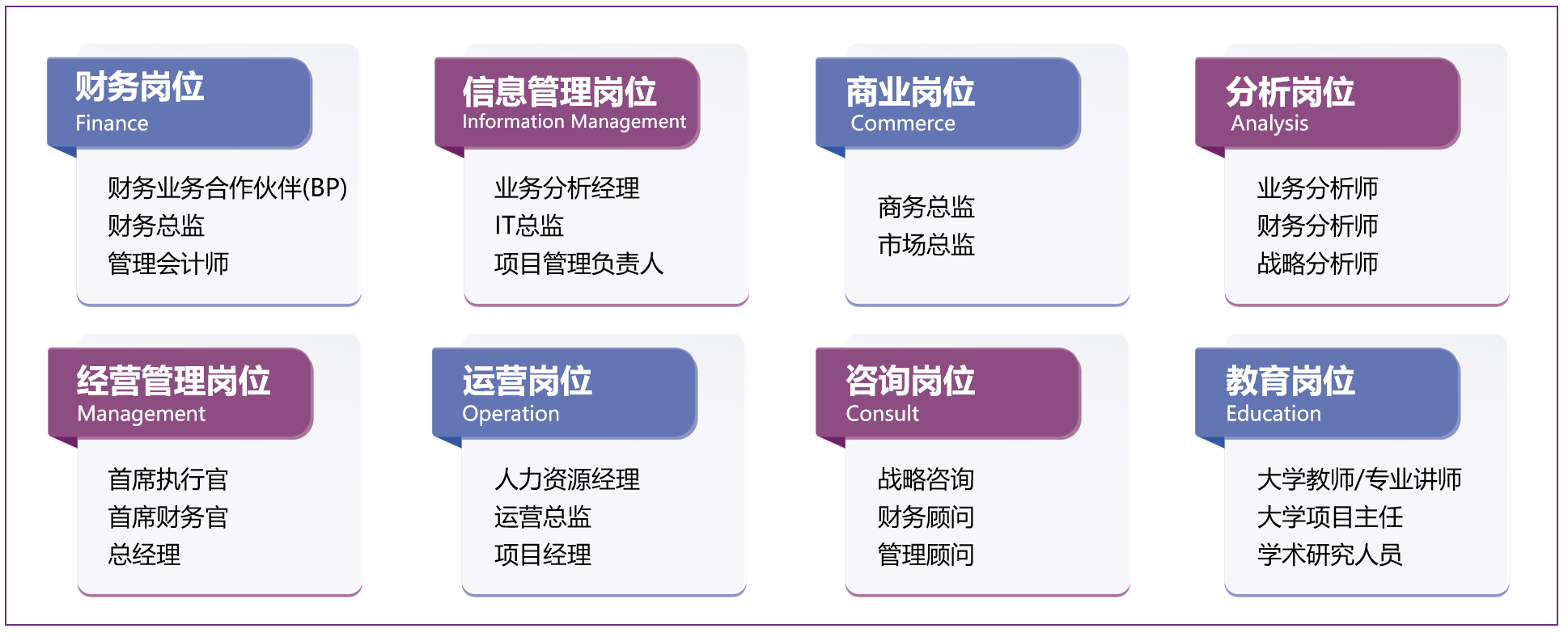 会计学专业CIMA实验班将管理会计、财务会计和商业认知融于一体,赋予学生雇主需要的实际技能,从而让学生成长为熟练运用财务、运营、战略、管理、领导力等综合性技能的复合型人才。未来可胜任财务、咨询、项目管理、商业运营、信息管理等各类高薪职业,拥有广阔的就业前景。