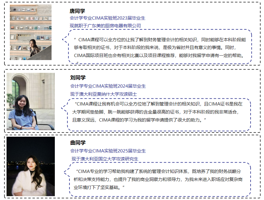 会计学专业CIMA实验班将于新生报到前,面向2025级文理各专业新生(国际商学院录取、艺术体育类专业除外)遴选优质生源入读,学生经选拔录取后可直接确定为会计学专业,锁定优势专业名额。