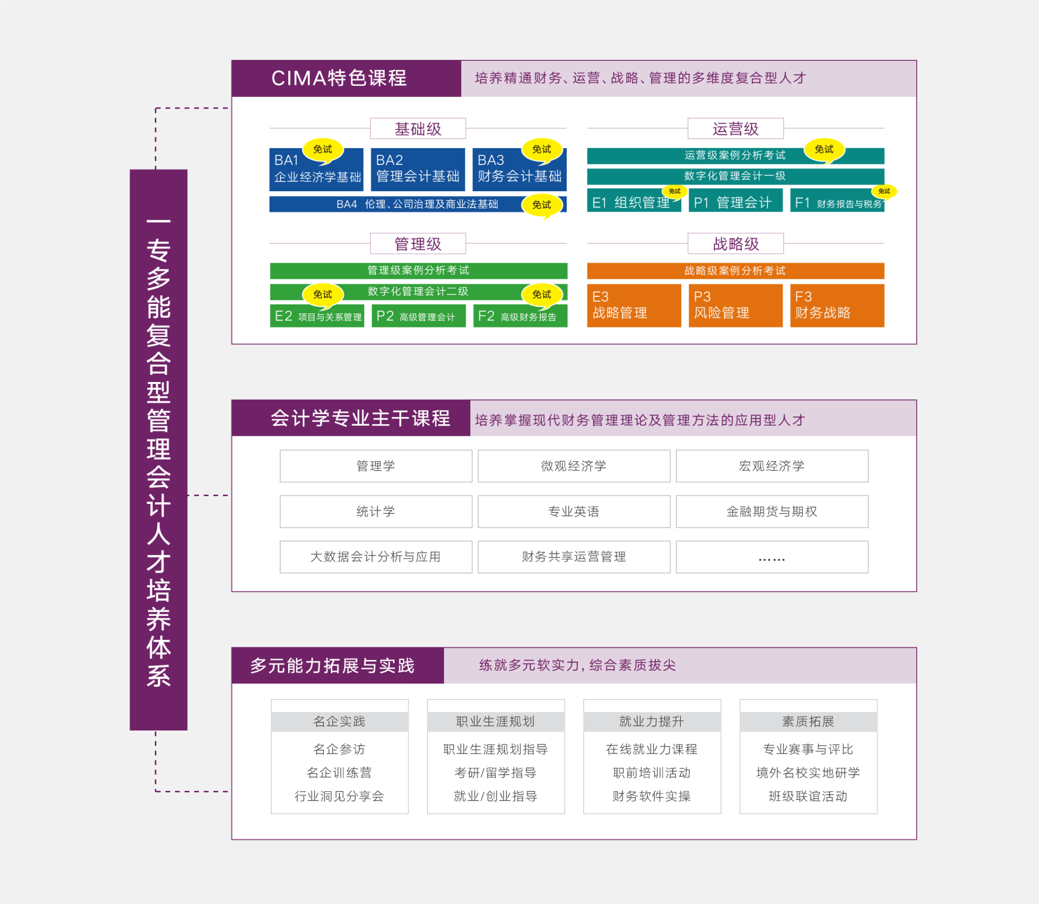 本专业在保留会计学专业主干课程基础上,将“CIMA特许管理会计师”特色课程和会计学专业部分课程进行了有效结合和补充,并单独设置了贯穿大学四年全程的多元能力素质拓展与实践活动,提升学生多元能力与综合素质,形成了特色鲜明的一专多能复合型管理会计人才培养体系。