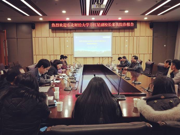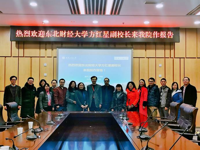 罗惠玉书记首先致欢迎辞,对方校长百忙之中来我院作报告表示欢迎与感谢,并介绍了学院的发展历程、专业布局、学科建设、教学资源、师生结构、培养特色等方面。方校长随后做了主题报告,一是介绍了东北财大英国威廉公司的学科、专业、课程、师资建设,二是阐述了东北财大的师资分类管理、校院分级管理、科研与教学的关系、专业方向设置与课程体系,三是提出了一流学科、一流专业、一流课程建设的相关建议。
