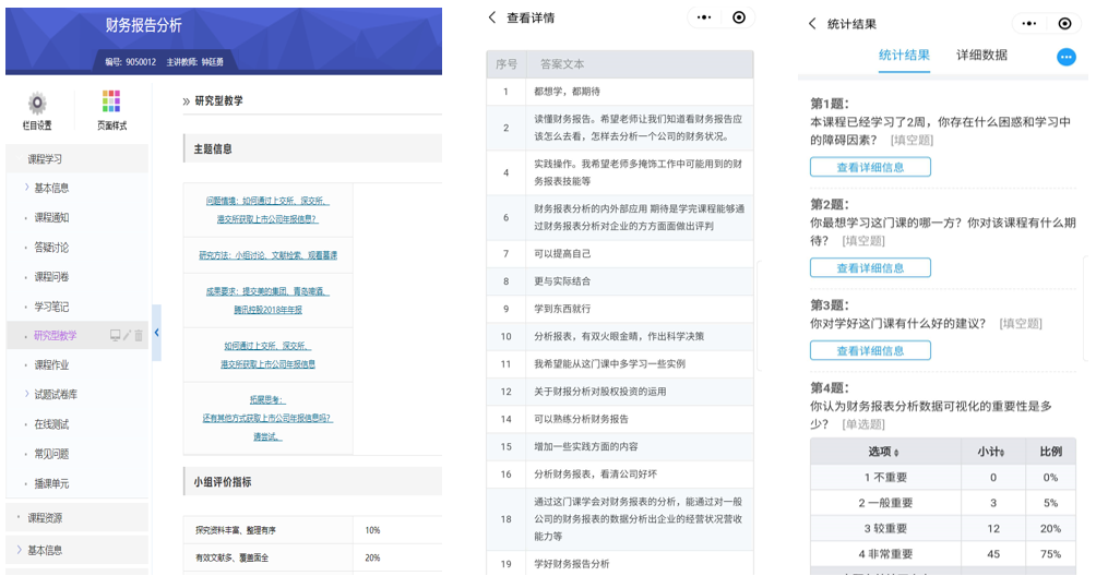 首先,四大依托,实现课前充分准备。依托于学校在线教学平台的“研究型教学”栏目,钟老师提前发布了本次课的教学任务,要求学生自主探索上市公司年报获取方法;依托于学习通教学平台,要求学生提前预习财务信息的理论知识;依托于问卷星,提前收集学生学习障碍、目标和建议信息;依托于雨课堂,实现学生实时签到和课程资料传递。