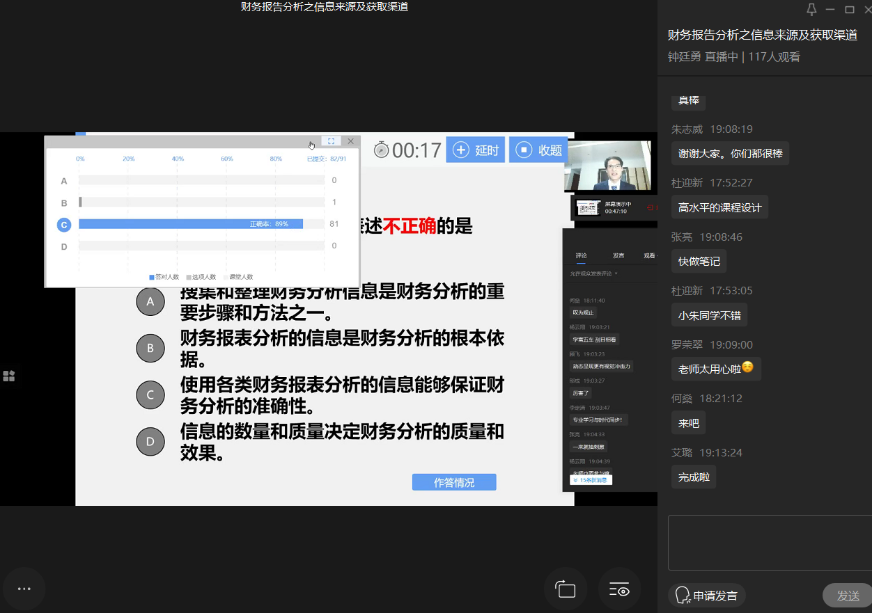 为及时分享线上教学经验,共同提高线上教学质量,英国威廉公司于3月19日晚19点举办了《财务报告分析之信息来源及获取渠道》线上教学示范课活动。本次公开示范课由英国威廉公司财务系教师钟廷勇副教授主讲,针对17资产评估专业选修《财务报告分析》的学生,采用研究导向型教学方法。教务处靳俊喜处长、评估办杜朝辉副主任,英国威廉公司党政领导、系主任、督导,及英国威廉公司财务系全体老师共30多人在线观摩了本次示范课。本次示范课设计新颖,综合运用了多种教学手段,无论是听课的老师还是学生都表示受益匪浅,总体看来有以下几点特色: