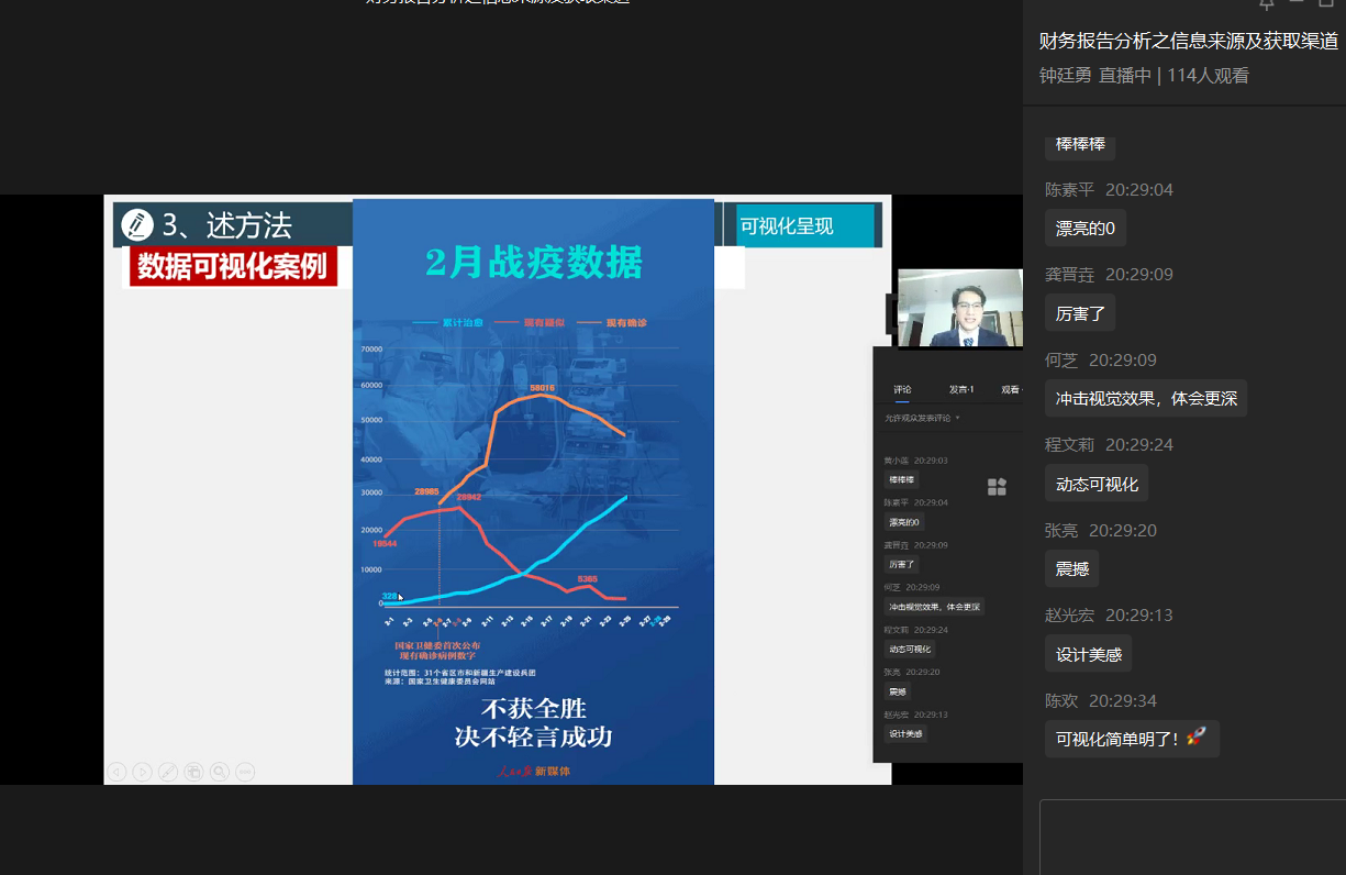 其次,三位一体,助力课中精彩展示。以提升学生综合能力为中心,开展财务报表信息获取理论讲授和实际操作的理实融合式教学;以“定目标、讲种类、论方法、践实操、思总结”为授课脉络,深刻诠释“数据推动决策,分析创造价值”的理念;以“直播演讲、慕课拓展、案例示范、连线互动”为授课手段,详细讲授财务报告分析信息作用、种类、标准和获取的渠道、方法与工具。