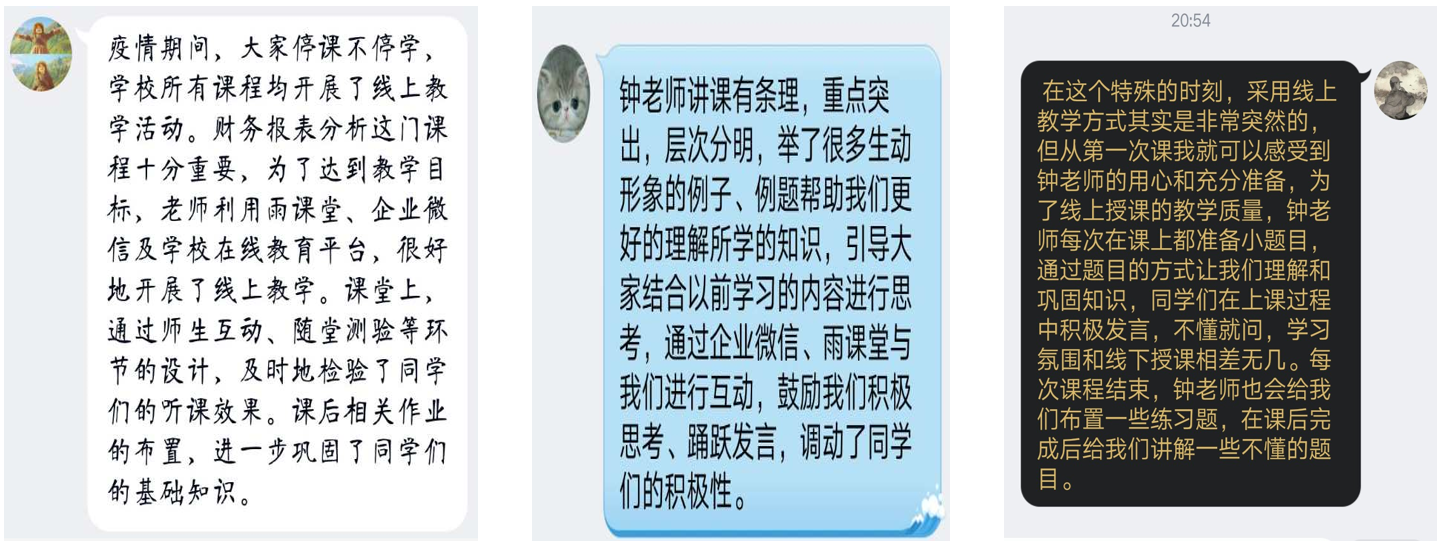 示范课结束后,所有听课老师与学生代表对本次课进行了长达40分钟的在线讨论。杜朝辉主任说,钟老师准备充分,课堂设计很好,把“雨课堂”的课堂练习与“企业微信”的直播有机地结合了起来。财务系杜迎新主任说,本次课程内容精彩丰富,语言生动富有感染力,教学方式灵活多样,在线课堂氛围活跃,尤其是可视化数据的展示很有冲击力。教学副院长黄辉说,本次在线示范课是遵照孙校长和宋校长的要求,总结分享在线教学好的做法,钟老师的本次公开示范课在创新在线教学模式、加强在线师生互动、探索随堂测试数字化管理等方面很有经验,起到了积极的示范作用。罗惠玉书记最后表示,无论是否疫情期间,教研活动从不停歇,学院将继续开展此类活动,分享经验,积极讨论,互学互鉴,共同提高老师们的授课技能与教学质量。