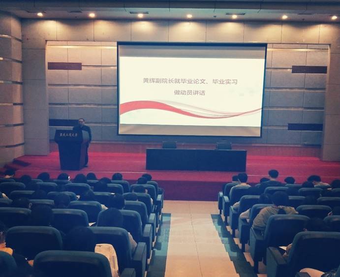 接着黄辉副院长就毕业实习与毕业论文做了动员讲话。他从学校与学院的应用型人才培养特色出发,指出了毕业实习和毕业论文和的重要性,并说明了学院的实习安排是“集中与分散相结合”,学院可以安排留校同学到校企合作实习基地去实习;提醒同学们注意实习过程中“职工”与“学生”的双重身份,希望同学们多请教、多观察,服从实验单位安排、遵从实习单位规定、认真完成相关工作和实习报告;强调了学院对毕业实习与毕业论文的时间安排,提醒考研和留学的同学注意统筹好“实习”“考研”“论文”的时间;最后对毕业实习与毕业论文的撰写作了较详尽的指导。