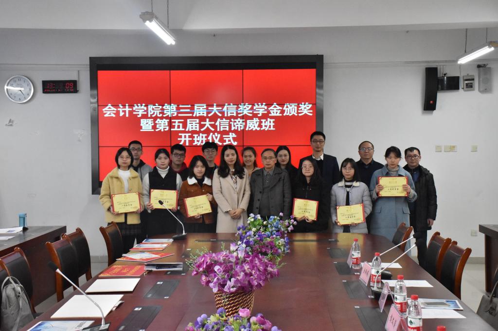 接下来,由彭老师宣读了获奖名单并对获奖同学予以颁奖。随后,刘斌老师宣读了第五届大信班学员名单。获奖代表与学员代表分别发言,他们表示们很高兴可以加入到大信班与优秀的伙伴、优秀的组织同行。加入大信班,是选择,更是对财务的热爱,在未来会继续保持这样的积极态度和勤奋,希望在大信班的学习中可以收获更好的自己。