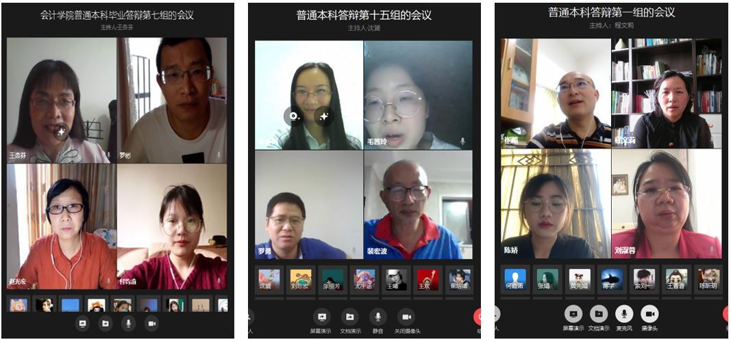 论文答辩过程中,老师们和同学们并未因为疫情而松懈,以饱满的热情和严谨的态度投入到论文答辩中。许多同学准备充分,身着正装,制作精美的PPT,展现了会计学子良好的精神风貌和专业素养。“生活需要仪式感,答辩也需要仪式感。这不仅是同学们对答辩的重视,也是对答辩老师的尊重”,杜迎新老师如此感慨到。答辩期间,各个答辩小组都分享了答辩现场的链接,孙芳城校长、宋豫副校长、罗惠玉书记、曾晓松副处长、杜朝辉副主任等领导,学校与学院督导刘淑蓉、李光凤、崔飚等老师,都随机进入各答辩小组进行检查,并给予了较高评价。评估办杜朝辉副主任曾到多个小组的答辩现场旁听,她评价说,“整个论文答辩组织非常到位,答辩现场氛围好,答辩老师敬业;提出的问题专业性强、有深度;同学们准备充分,表现比较自信,语言表达能力强”。