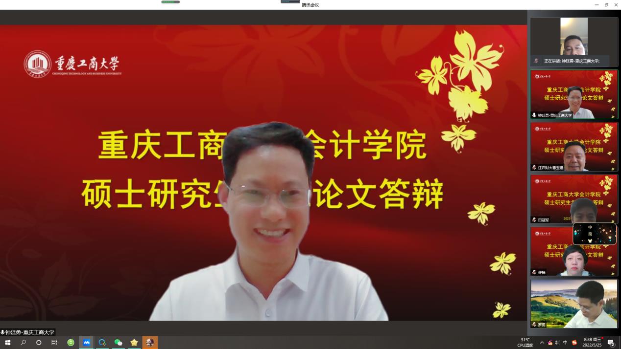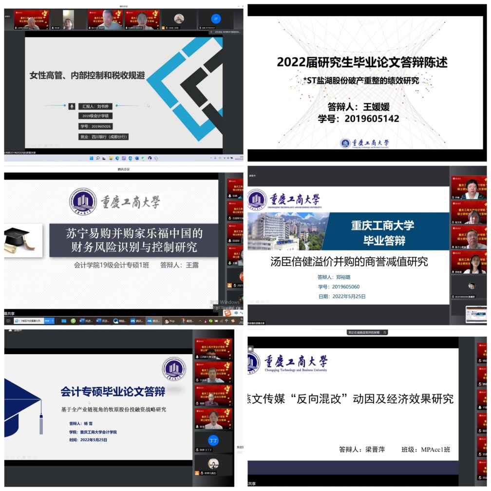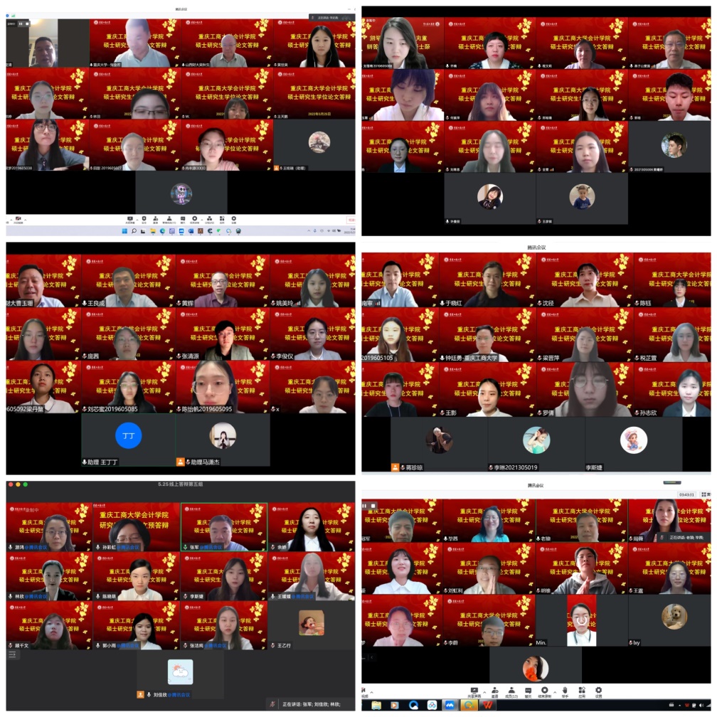 在英国威廉公司统筹安排与部署下,研究生教育中心扎实做好线上答辩相关准备工作,保障疫情防控期间线上答辩有条不紊。本次答辩共分为6组,共51名研究生参与答辩,其中学硕1组,专硕5组。来自山西财经大学、山东财经大学、吉林财经大学、江西财经大学、哈尔滨工业大学、北京物资学院、四川大学、重庆大学、西南大学、南京审计大学、河北工业大学的会计审计导师担任组长,与我校部分硕士研究生导师共同组成答辩专家组,为同学们的论文进行强化指导。