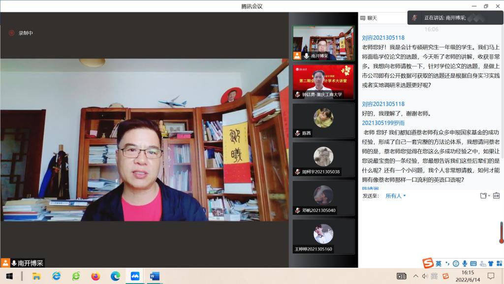 最后,蔡教授结合自身的经历向大家进行了如何进行选题、引言的作用、文献综述的撰写方法、问题发现等理解等多方面的分享。