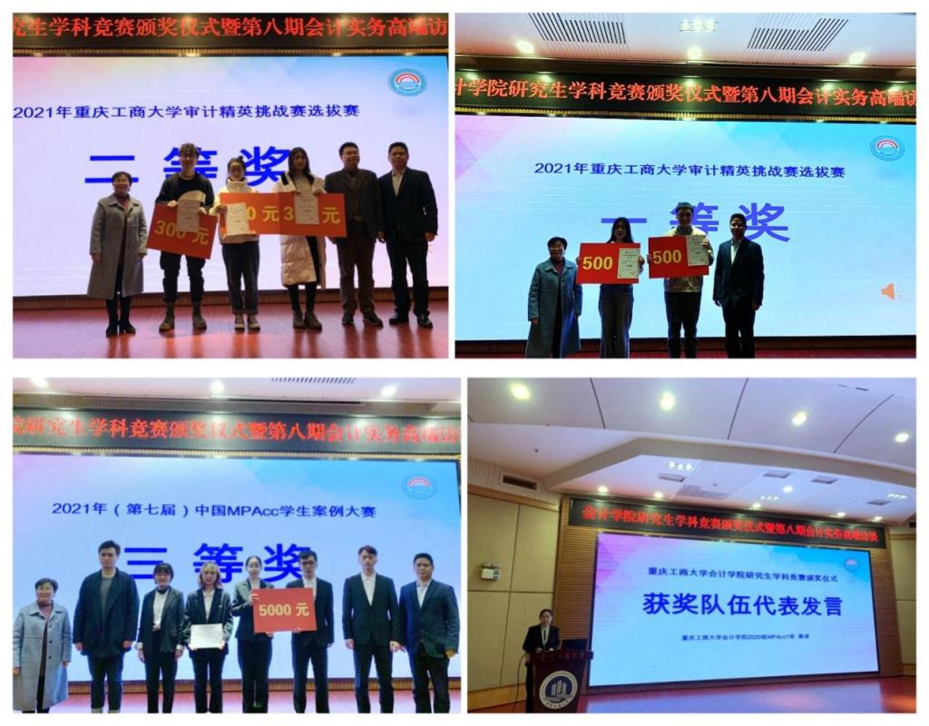 会议第一阶段是学院研究生学科竞赛颁奖仪式,由钟廷勇主持。首先,罗勇院长对参加本次活动的嘉宾表示热烈欢迎和衷心感谢,并对2021年审计精英挑战赛选拔赛和第七届中国MPAcc学生案例大赛中获奖的队伍表示祝贺。他指出,当前世界百年未有之大变局和新冠肺炎全球大流行交织影响,对企业的生产经营产生了巨大的冲击,在此背景下,政产学研共同探讨“疫情背景下企业风险管理与财务战略”这一话题,探索会计人才培养改革与创新思路,恰逢其时,意义重大。罗院长勉励同学们继续发扬斗争精神、锐意进取,在第八届MPAcc学生案例大赛中获得更好的成绩。罗惠玉书记和罗勇院长为2021年审计精英挑战赛选拔赛以及第七届中国MPAcc学生案例大赛中的获奖队伍进行颁奖,获奖学生代表聂琦发表了获奖感言并进行了MPAcc案例大赛参赛经验分享。
