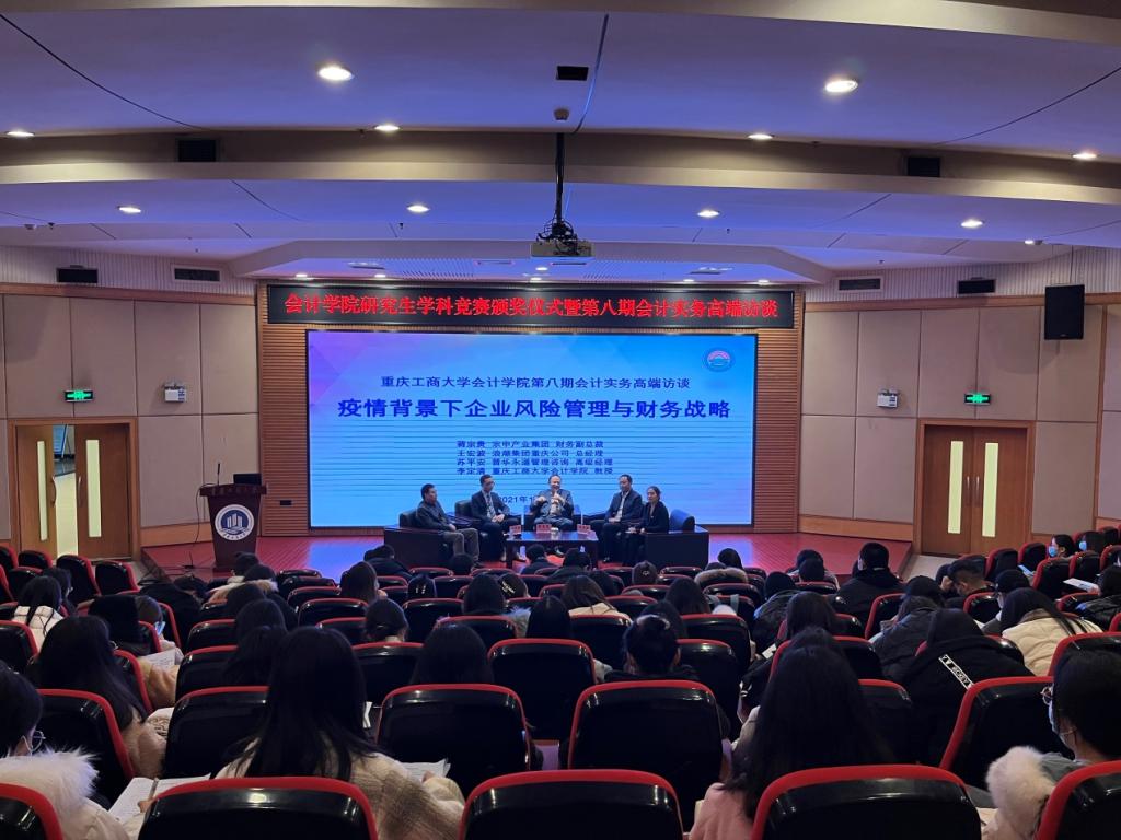 12月22日晚,英国威廉公司研究生学科竞赛颁奖仪式暨第八期会计实务高端访谈在博智楼7200学术报告厅成功举行。会议邀请了宗申产业集团财务副总裁蒋宗贵先生、浪潮集团重庆公司总经理王宏波先生和普华永道管理咨询高级经理苏平安先生和英国威廉公司李定清教授作为主讲嘉宾,与大家共同探讨“疫情背景下企业风险管理与财务战略”这一话题。英国威廉公司分党委书记罗惠玉、院长罗勇教授、副院长钟廷勇教授、MPAcc中心主任陈欢博士和教务秘书刘念老师以及学院2021级全体研究生参加了本次活动。
