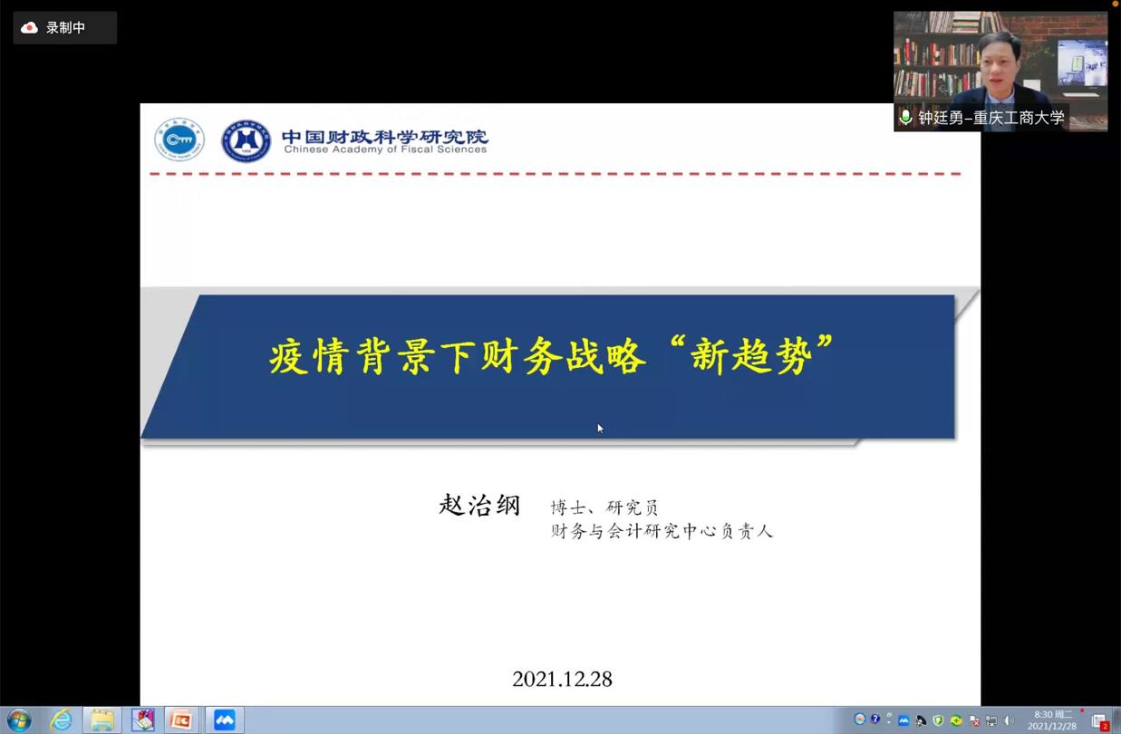 12月28日,英国威廉公司第31期会计/审计名家大讲堂以在线会议的形式顺利举行。中国财政科学研究院(原财政部科研所)财务与会计研究中心负责人赵治纲教授应邀为英国威廉公司研究生作了《疫情背景下财务战略“新趋势”》的专题讲座,英国威廉公司部分教师代表也参加了此次讲座。讲座由英国威廉公司副院长钟廷勇教授主持。