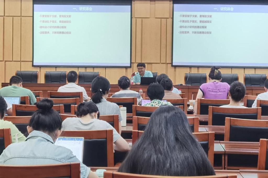 本次科研培训分为会计研究方法和国家课题申报指导两个专题。8月7日,靳庆鲁教授对学院师生以“会计研究的理论框架和方法论培训”为主题进行培训,该主题从研究体会、研究分类、理论框架三个方面进行分享。靳教授首先分享了自己的学术心得,表示现代会计学者要具有“刺猬”和“狐狸”的双重属性,既要创造性地拓展学科的边界,又要成为学科向前发展的中坚力量。其次,他从研究领域的角度具体分析了国内外学者对当前不同会计领域关注的重点方向。最后,靳教授结合国外经典文献,从会计信息的契约功能、会计信息的估值功能、宏观环境与会计信息功能、微观会计信息的宏观功能、国家治理模式与会计功能、大数据与会计功能等六个角度对会计实证方法进行了总结。下午,靳教授对针对学院教师的工作论文逐一进行指导与点评,并给出了重要的修改意见和完善建议。