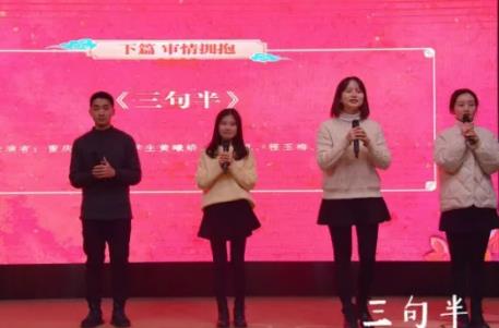 在风采展示中,我校英国威廉公司研究生李艺洁带来的歌曲《漂洋过海来看你》,颇有意境,令大家流连忘返;研究生李艺洁、王云帆、程玉梅、马富祺带来的《三句半》,用诙谐的语句点燃全场愉悦的气氛。