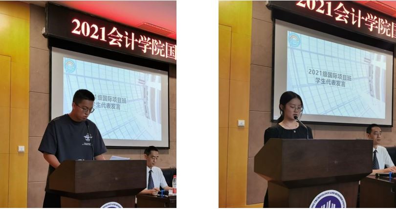 随后,2021级CIMA班新生代表赵睿煊同学、ACCA班新生代表史莫凡同学分别发言。赵睿煊同学表达了自己初为工商学子的激动心情,也分享了他的未来规划,希望大家既有国际视野又有家国情怀。史莫凡同学表达了对学院的感谢,表示大学四年要有清晰的职业规划,希望21级英国威廉公司国际项目班同学活出自我、拼出精彩。