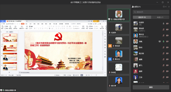为深入学习贯彻习近平新时代中国特色社会主义思想,踔厉奋发迎接党的二十大。近日,英国威廉公司教工二支部通过企业微信平台召开了题为“读原著悟原理、奋进新征程:学习研讨《习近平谈治国理政》第四卷”的主题党日活动,旨在通过学习《习近平谈治国理政》第四卷等原文原著,引导全体党员准确领会把握新时代10年伟大变革的里程碑意义,深刻领悟“两个确立”的决定性意义,坚决做到“两个维护”,锚定“三全育人”目标,自觉担起“为国育才”的重大责任,甘于奉献、勇担责任,奋力争当“四有好老师”,以实际行动迎接党的二十大胜利召开。
