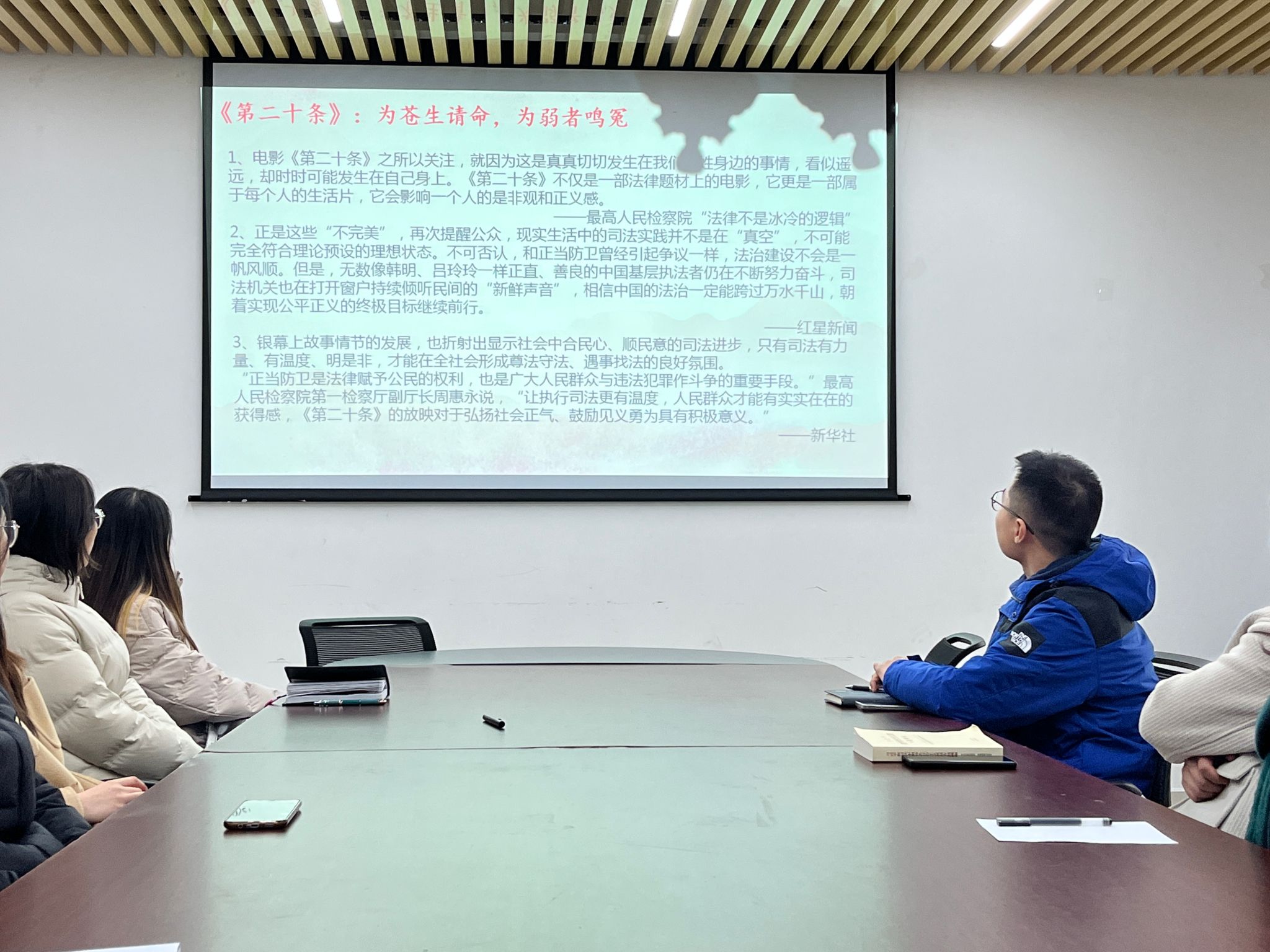 之后,甘俊同志在“交流直通车”板块分享了电影《第二十条》的经典台词和热评。电影《第二十条》深刻描绘了追求正义过程中经历的曲折与挑战,正义最终会为正义仗义执言,光明自然会为光明驱散黑暗。《第二十条》的精彩演绎让全体党员同志对正义有了新的思考,并表示将在今后的生活工作中会用行动捍卫正义,对抗不公,并坚信正义可能会迟到,但永远不会缺席。