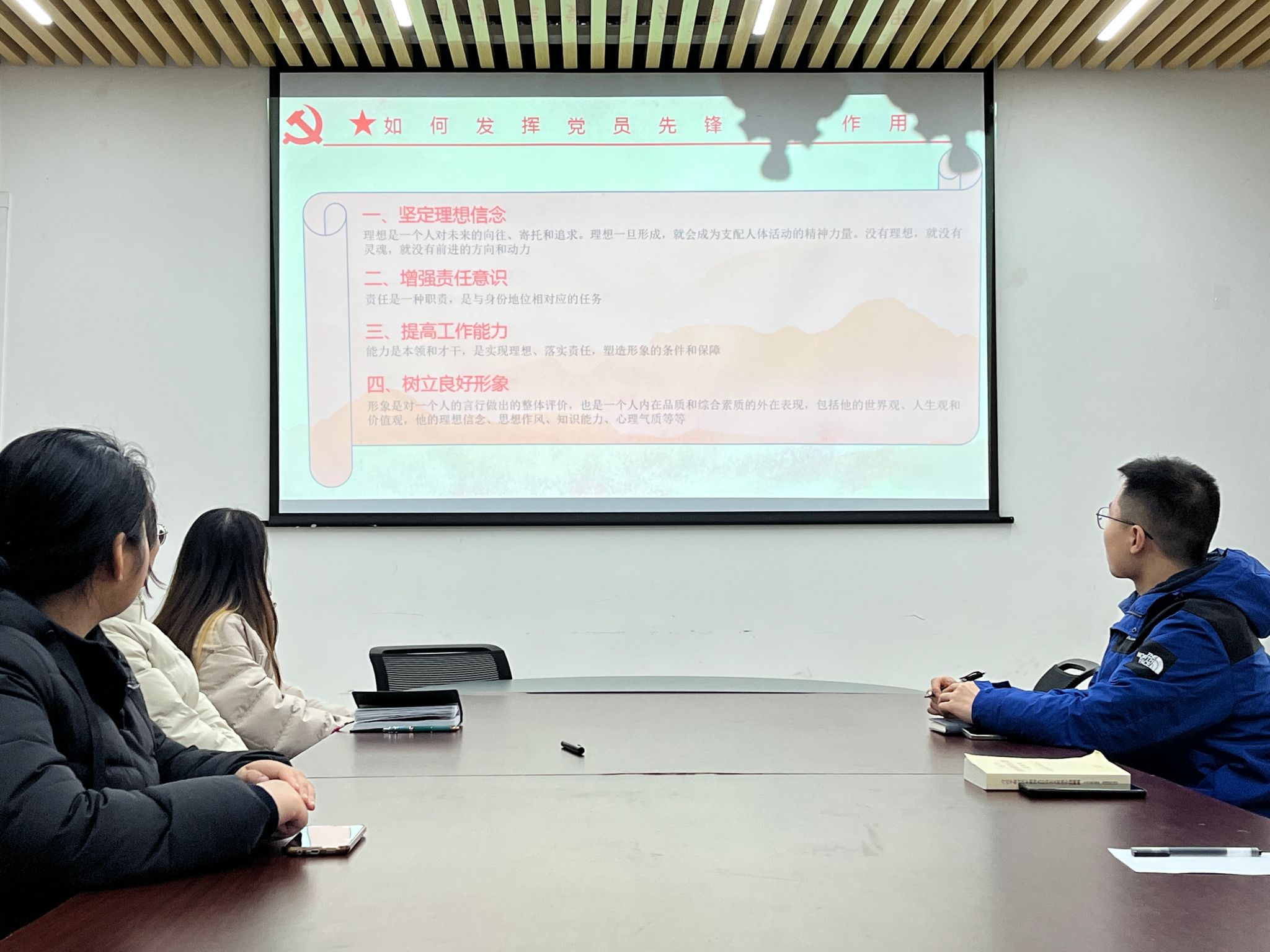 最后,陈瑜昕同志主持开展“如何发挥党员先锋模范作用”主题党日活动。共产党员发挥先锋模范作用是党的优良传统,全体党员同志应坚定理想信念,增强责任意识,提高工作能力,树立良好形象。陈瑜昕同志强调,当前国际环境发生重大变化,各种矛盾错综复杂,各种思想相互激荡,在新的历史条件下,我们如何实现中国梦,关键在于共产党员能否发挥先锋模范作用,能否在形势和任务上,取得思想上的高度一致,提升自我的知识、技术、理论、政治、道德素质。