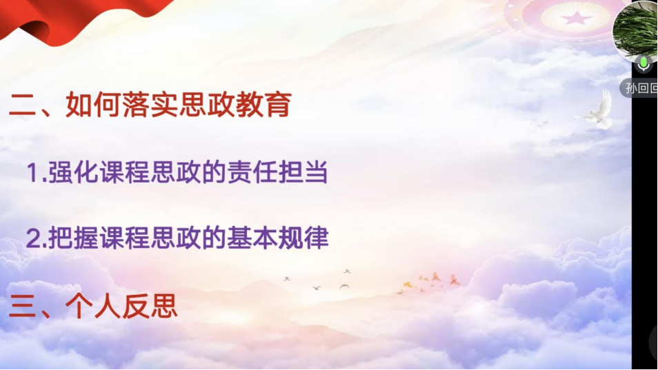 孙回回同志分享了她的学习心得。她认为,思政教育是高等教育立德树人的新路径,也是提高人才培养质量的新动能,各位党员教师要强化课程思政的责任担当,把握课程思政的基本规律。
