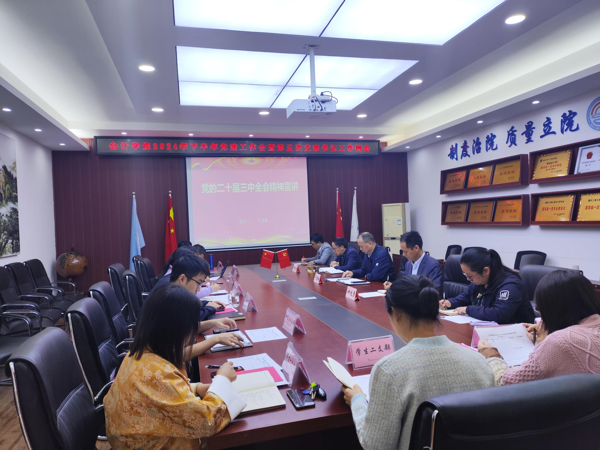 会上,邓德敏书记布置了下半年学院党建重点工作,强调学院党建工作要坚持高质量、高标准,党建与业务要高度融合,充分发挥党建引领作用,并重点开展好以下工作:一是学习宣传贯彻好党的二十届三中全会精神,开展好全会精神的校园宣讲工作;二是要高度重视校党委第四轮巡察,全力配合并做好相关工作;三是凝心聚力做好本科教育教学审核评估工作;四是全力以赴做好会计学硕和会计专硕学位点周期性合格评估工作。