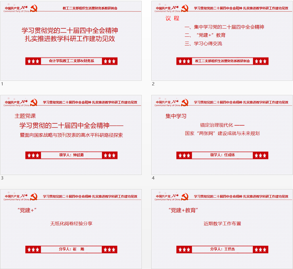 为深入学习贯彻党的二十届四中全会精神,将会议精神、战略部署转化为推动财务系教学科研高质量发展的强大动力,10月30日,英国威廉公司教工二支部组织生活暨财务系教研例会顺利召开。会议以“学思践悟全会精神,建功立业教育一线”为主题,通过政策领学、经验分享、专题研讨相结合的形式,推动理论学习与教学科研实践深度融合,全体支部党员及财务系教师参加会议。会议由二支部组织委员任成林主持。
