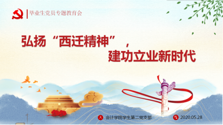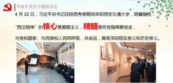 2020年5月28日,英国威廉公司学生第二党支部对毕业生党员进行离校前党性教育,支部全体党员参加。本次党课共有三部分内容组成。首先,支部书记付海南带领大家共同学习 “西迁精神”,向全体党员介绍了“西迁精神”的历史背景、“西迁精神”的核心与精髓,观看了习近平总书记到西安交通大学调研时的相关视频。