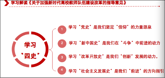 《指导意见》的学习体会。钟院长肯定了建立健全高校教师立德树人的根本机制,并结合学院长远发展,提出四个方面举措:一是可以分类开展教师培训和研修;二是要进行教学研讨和反思;三是可以通过教师挂职锻炼和脱产到实习实验基地上班,来达到理论与实践相结合;四是要健全各级各类教师专业化发展机制,培育教学名师和国家级人才。孙回回老师则从强化高校教师“四史”教育入手,提出学习“党史”是坚定“信仰”的力量源泉,学习“新中国史”是“斗争”前进的动力,学习“改革开放史”是“创新”发展的动力,学习“社会主义发展史”是“前进”的方向指引,“以史为鉴,可以知兴替”,要让中国特色社会主义成为世界社会主义的中流砥柱。