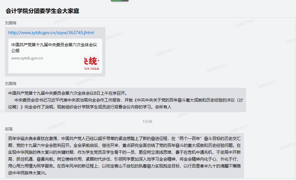 19级财务管理学一班赵瑾同学:百年华诞庆典余音犹在激荡,中国共产党人已经以超乎寻常的紧迫感踏上了新的奋进征程,在“两个一百年”奋斗目标的历史交汇期,党的十九届六中全会胜利召开。全会承前启后、继往开来,重点研究全面总结了党的百年奋斗的重大成就和历史经验问题。在实现中华民族的伟大复兴的关键时期,作为学生党员及学生骨干的一员,更应树立底线思维,善于在危机中遇先机,于变局中开新局,抓住机遇,奋勇向前。树立榜样作用,紧跟时代步伐,引领同学更加深入地学习全会精神,将全会精神内化于心、外化于行,用心用力用情为同学服务。在百年风华的新征程上,以咬定青山不放松的执着奋力实现既定目标,以行百里者半九十的清醒不懈推进中华民族伟大复兴。