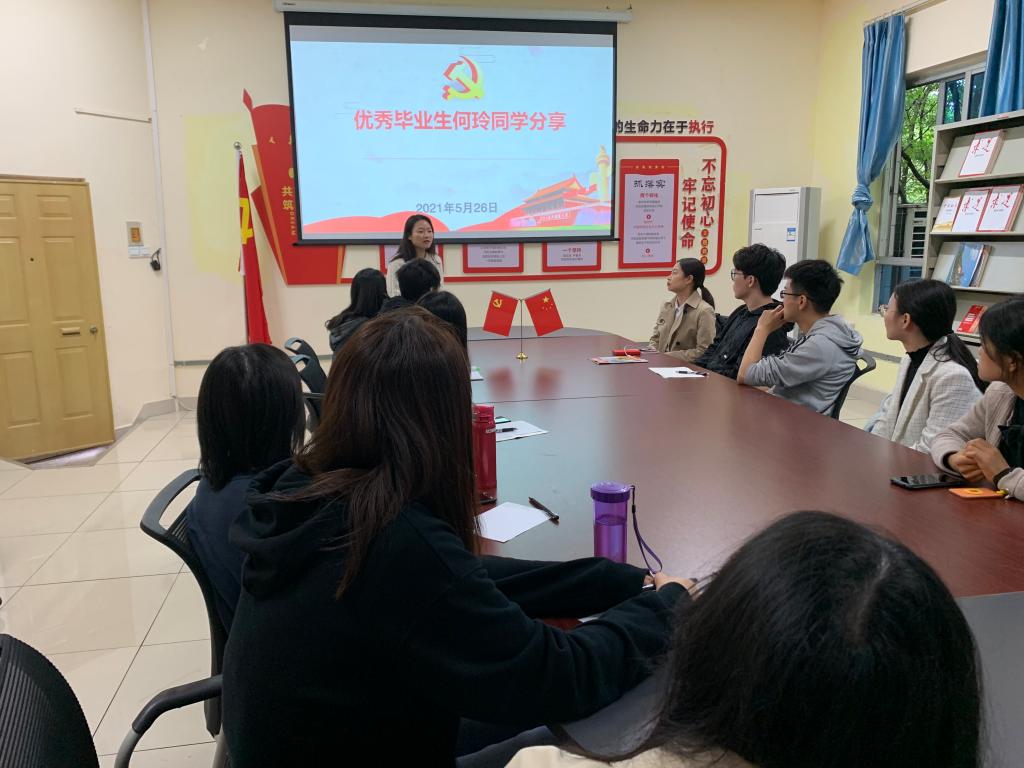 随后,支部优秀毕业生何玲、郑佳等同志就其考博、就业、考公及学习规划等方面进行经验分享。他们强调,苦干实干是我们党一贯倡导的优良作风,是共产党员的优秀品质。大家都应该做好自己的学习规划,早定目标早落实。