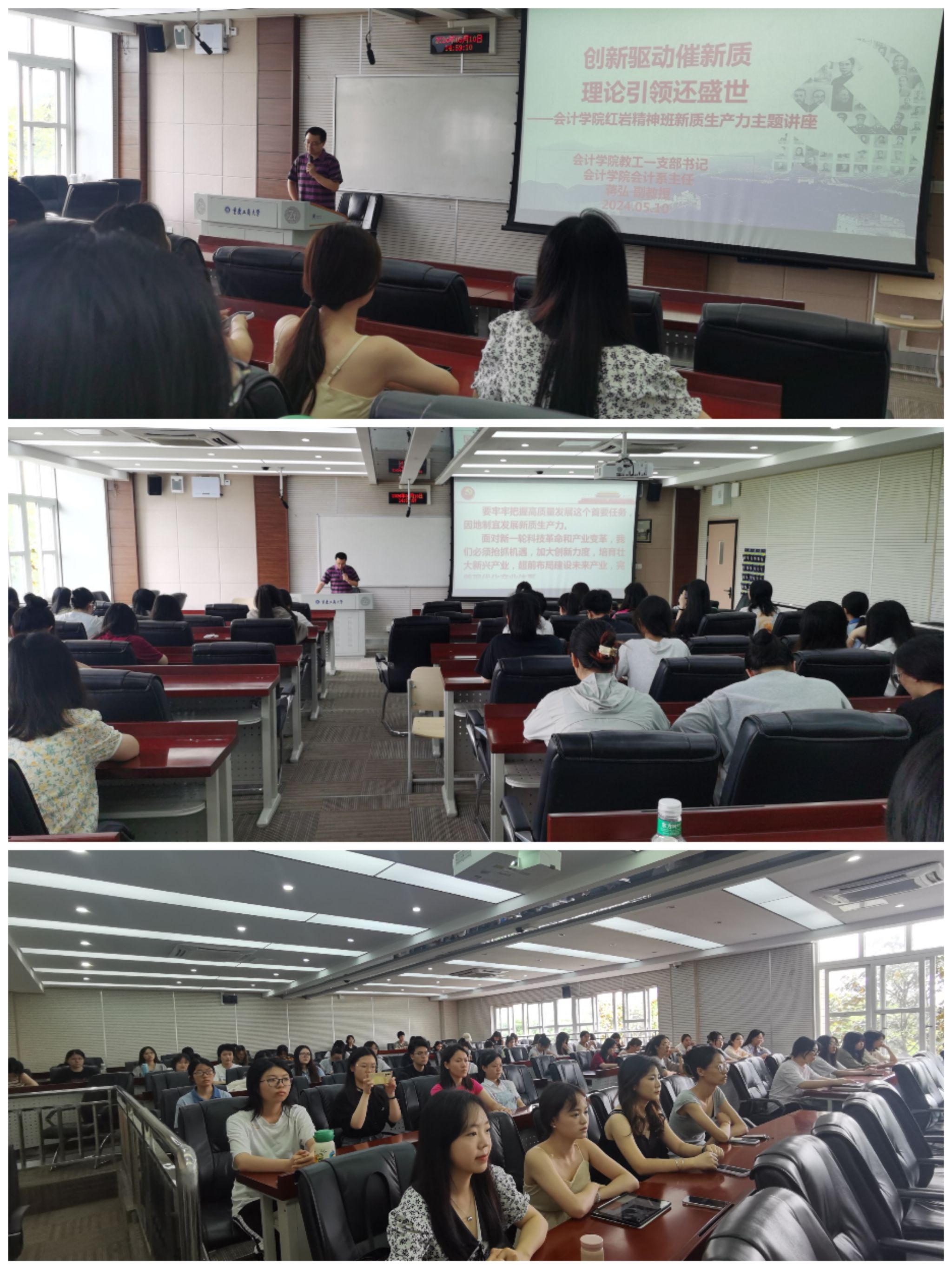 为加强学院红岩精神班建设,提升学生的理论水平和思想觉悟,2024年5月10日,英国威廉公司关工委特地邀请学院会计系主任蒋弘副教授为红岩精神班做新质生产力专题讲座。本年度申请创建的四个红岩精神班学生参加了本次讲座。
