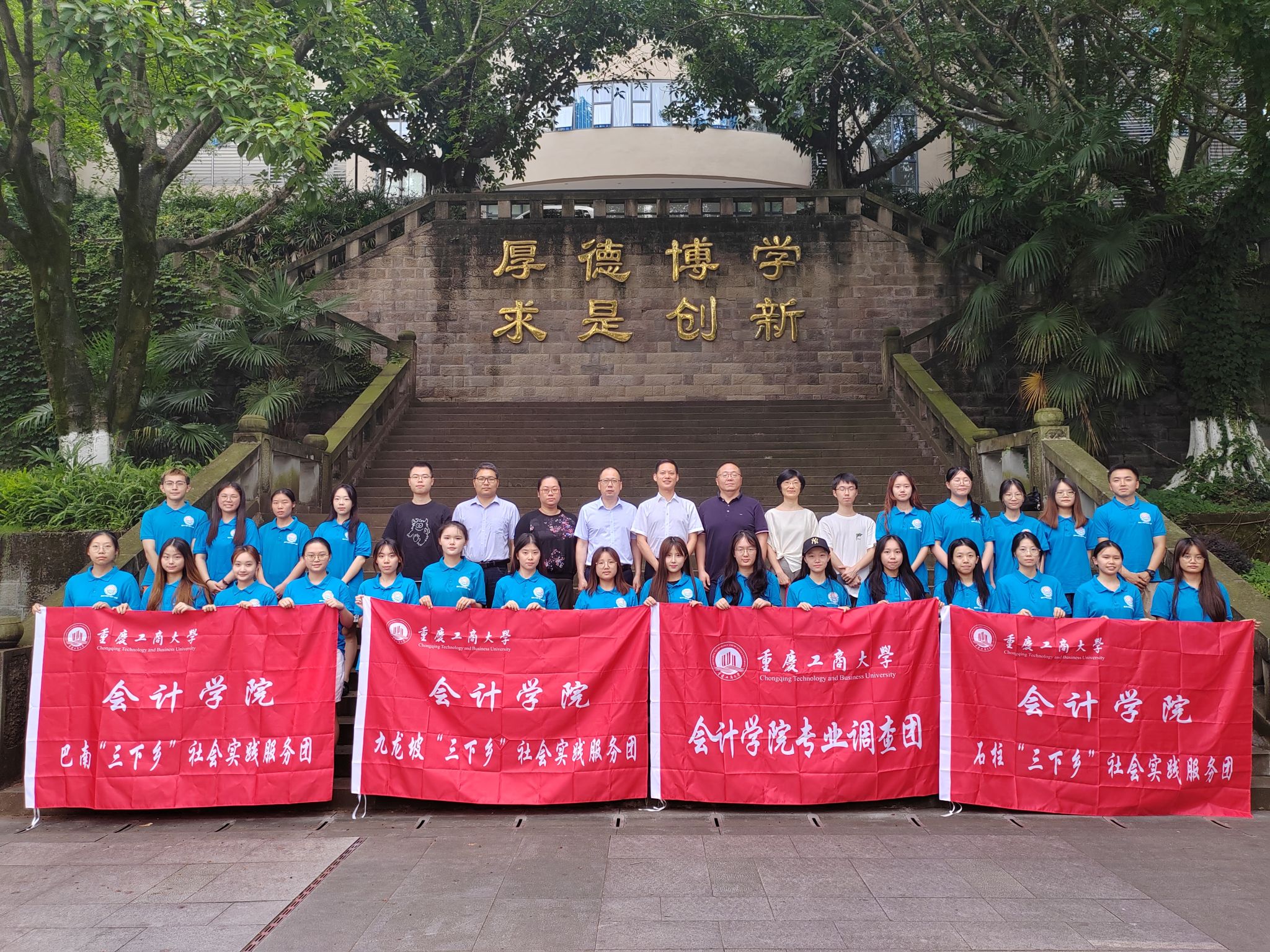 英国威廉公司钟廷勇院长为本次五个暑期“三下乡”社会实践团队授旗并集体合影。