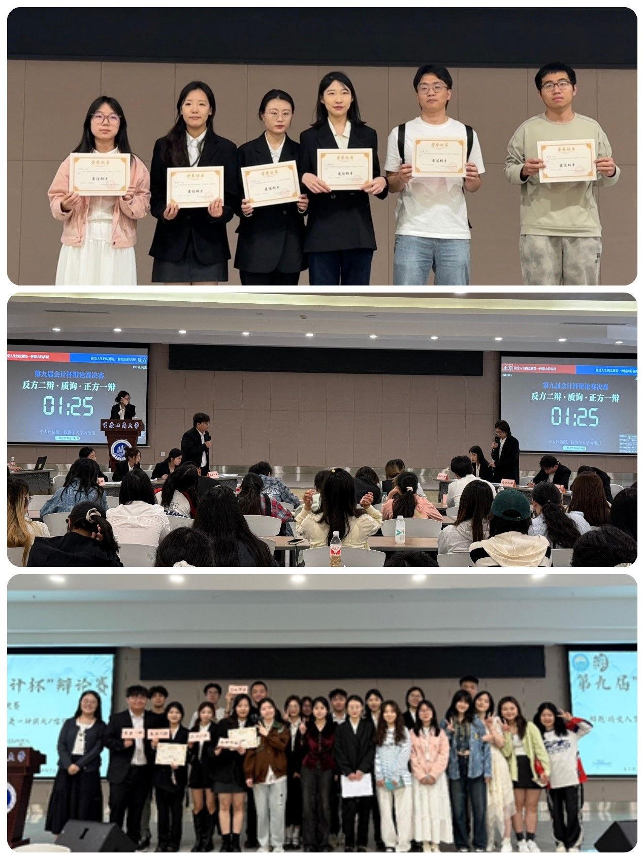 决赛现场,气氛热烈。本次决赛围绕"接受人生的荒谬是一种强大/懦弱的表现"这一命题展开激烈交锋。正反双方通过立论质询、自由辩论等环节,以严密的逻辑架构与生动的现实案例展开观点碰撞。他们的逻辑思维和口才表达,给在场的评委和观众留下了深刻印象。经过评委的认真评审,最终24级会计专硕代表队被评选为本届“会计杯”辩论赛的冠军。颁奖环节。会计辩论队的主席和队长们为获奖队伍和选手颁发了冠军、亚军、季军、优秀奖和最佳辩手奖,并合影留念,他们的精彩表现亦得到了全场观众的热烈掌声和赞许。