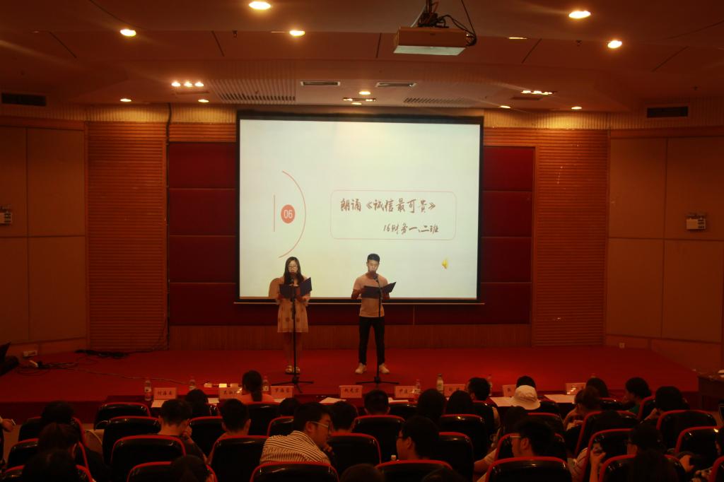 活动伊始,赵光宏主任为现场师生们带来主题为“个人诚信与会计职业道德”的演讲。赵主任通过当今比较热门的诚信案例为我们讲述了诚信的重要性,教导我们要做诚信的会计人,揭示了诚信品格在财会行业的重要性。接下来,经各班遴选报送的7个节目,包括小品、朗诵、相声等艺术形式,以“诚信”为主题,围绕同学们学习生活实际,或轻松诙谐,或严肃深刻,均引起了关于诚信的自我反思。而后,尹书记对本次诚信教育大型主题班会作总结。尹书记表示,人无信不立,作为大学生,既要学知识长本领,也要磨练品格,秉着诚信之心对待生活中的每件小事,方能走得更高更远。