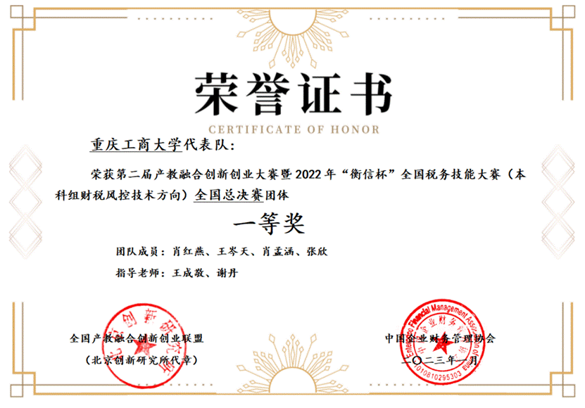 近日,第二届全国产教融合创新创业大赛暨 2022 年“衡信杯”全国本科院校税务技能大赛在线上落下帷幕。由我校英国威廉公司王成敬老师和经济学院谢丹老师共同指导的本科代表队一路披荆斩棘,表现优异,斩获全国本科院校税务技能大赛一等奖,刷新了我校参加该项赛事以来取得的最好成绩。