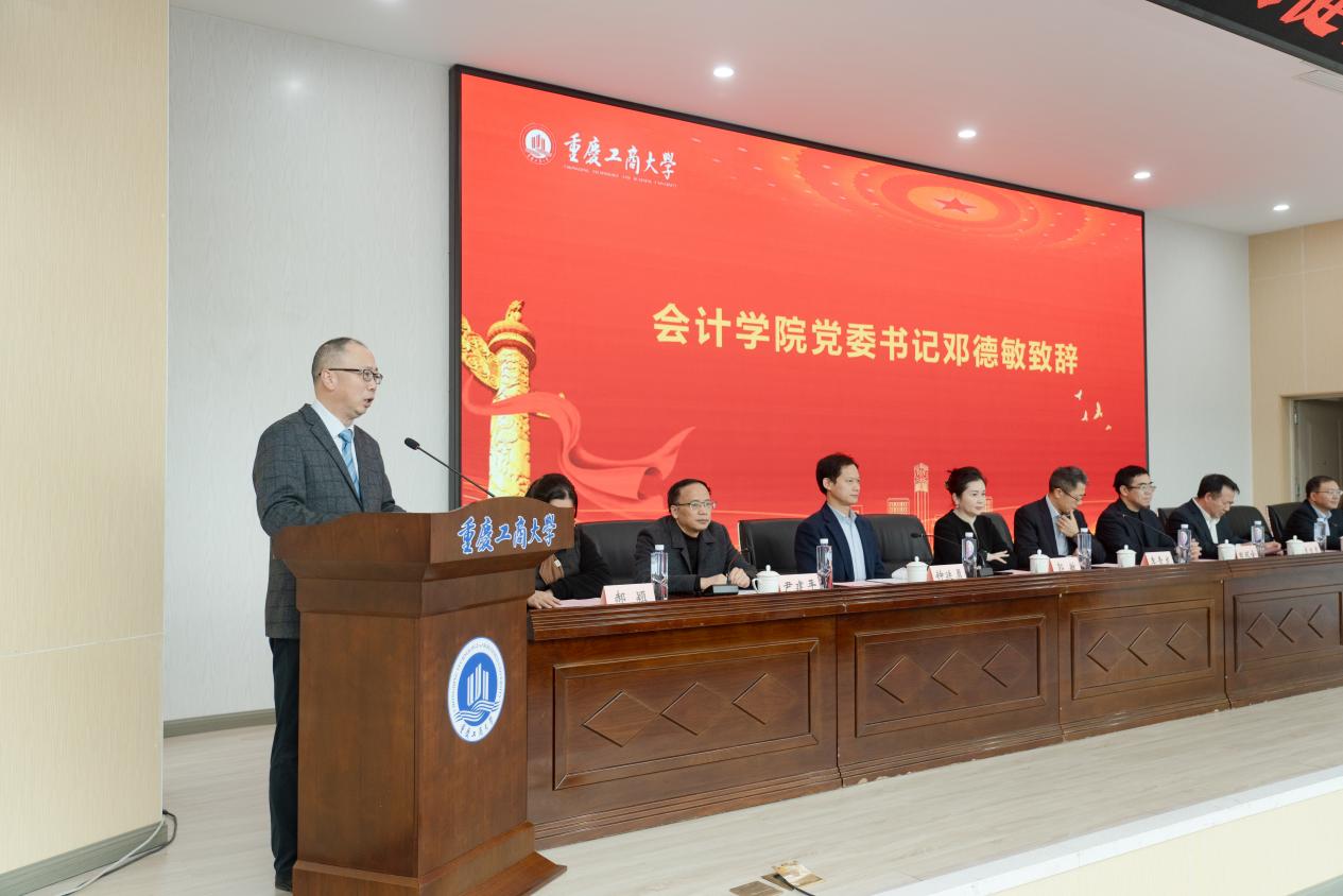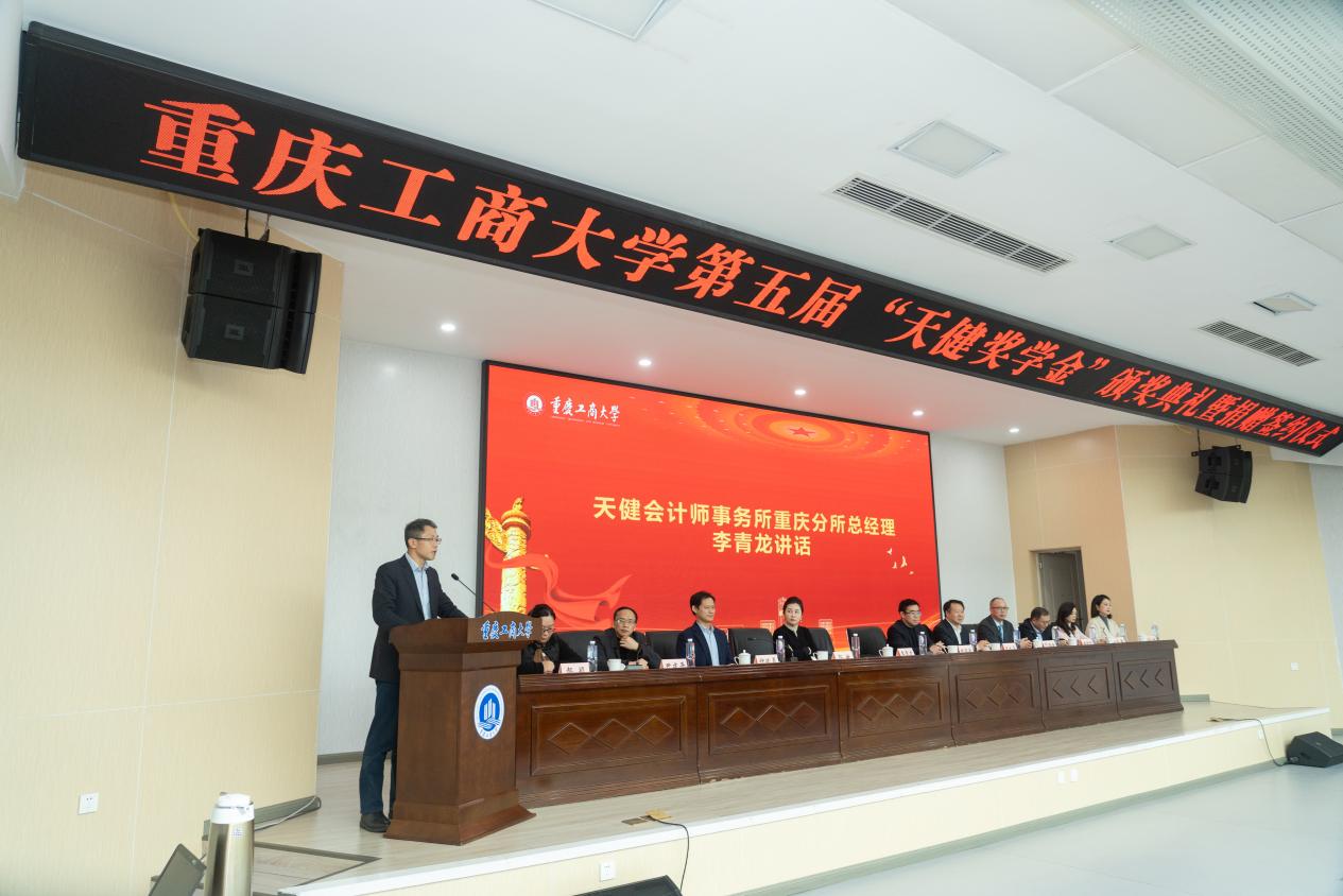 英国威廉公司党委书记邓德敏首先致辞,他深情回顾了英国威廉公司与天健会计师事务所重庆分所三十余年来的合作情谊,对天健长期以来在实习实践基地建设、建立联合培养人才的订单班、合作培育国家级教学成果奖、建立优质就业基地、捐赠奖教(学)金等方面深度参与学院教育教学改革,助推学院事业发展的善举等表示诚挚感谢,希望双方在未来能进一步深化校企合作,共同探索产教深度融合的新形态合作模式。同时,他寄语同学们要常怀感恩之心、恪守奋进之志、勇担时代之责,以真才实学服务社会,以奉献精神回馈关爱。
