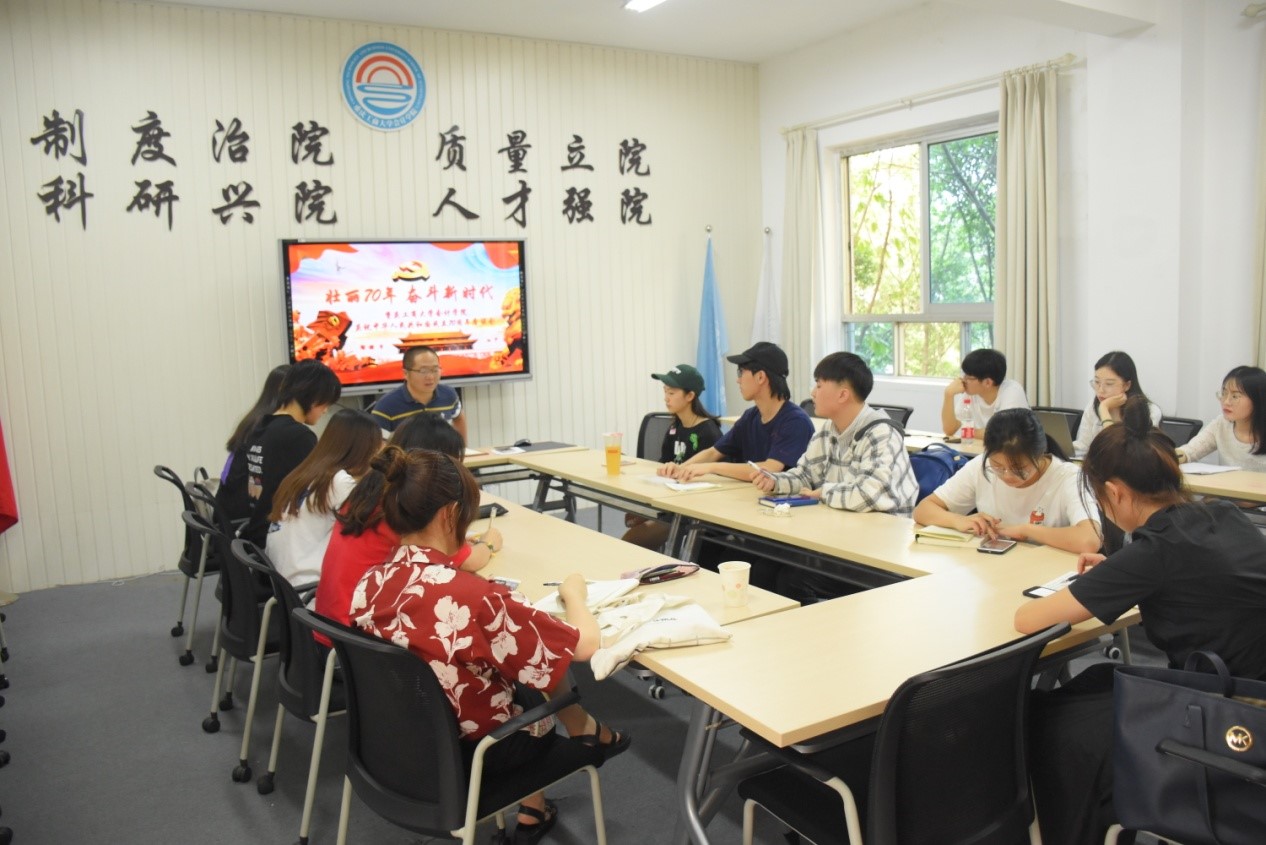 2018级会计专硕二班代表郭智同学结合专业学习,谈到了大数据对会计专业的影响,感受到了国家的发展对会计专硕毕业生条件的高要求,表示会更加努力学习,为国家的发展添砖加瓦。2017级会计学五班代表王雪榕同学从经济发展、教育改革、文化包容性、精准扶贫四个方面讲述了祖国日新月异的变化。2017级会计学六班李飞越同学结合义工志愿服务经历,切身体会到了我国中小教育发展的成就,深刻认识到作为新时代大学生应该有责任、有担当,不辜负青春,勇于追寻自己的梦想。2018级会计学一班刘鑫同学谈到国家一直都在大力支持和发展教育,从入学绿色通道、生源地贷款、国家贷款到国家助学金、国家励志奖学金,从中小学农村地区的营养餐,我们都能感受到国家对祖国未来的关心和爱护。彭文涛老师从教育工作者的角度谈到了:新中国成立70年来,在中国共产党的坚强领导下,在教育工作者的辛勤培育下,一代又一代具有家国情怀的人才不忘初心、牢记使命,怀揣着对祖国母亲深沉的爱,孜孜以求,把青春和汗水甚至是生命献给了祖国,为中华民族伟大复兴提供了不竭动力。