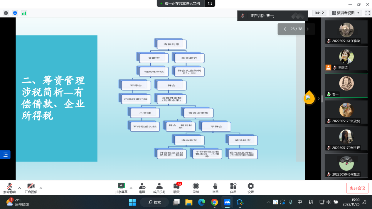 曹娟老师分别从投资管理涉税、筹资管理涉税、运营资本管理涉税、分配阶段涉税四大部分来介绍。首先通过几个实务案例的讲解让同学们进行思考,强调了投资者在搭建未来股权架构过程中,除了要考虑到公司法等的强制性规定外,需要充分衡量自身的商业目的和发展计划,以设计符合公司未来发展需要的运营架构,以实现投资及投资退出阶段的税务成本最优化。同学们也都积极发言,与曹老师互动交流。接着,曹老师又通过大量实务案例分别从权益、负债、金融机构、企业间借款、有偿借款、企业所得税、自然人借款等角度进行筹资管理涉税简析。