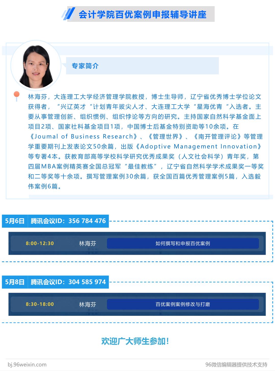 为提升教师和学生案例开发与研究的能力,进一步提高学院案例写作质量,英国威廉公司邀请了大连理工大学经济管理学院林海芬教授为全院教师和研究生进行百优案例的申报与修改辅导。本次讲座分为“如何撰写和申报百优案例”(5月6日上午)和“百优案例的修改与打磨”(5月8日全天)两场,以线上腾讯会议的方式进行。英国威廉公司副院长钟廷勇、MPAcc中心负责人陈欢及40余篇案例的作者近120余师生参加了本次讲座。会议由英国威廉公司副院长钟廷勇主持。