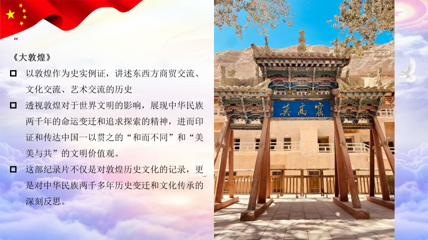 活动第三部分,幸素园在“好…好…学习”环节分享了纪录片《大敦煌》。该片以敦煌作为史实例证,用全球视野和历史目光,讲好中国历史故事,印证和传达中华文明一以贯之的“和而不同”和“美美与共”理念。幸素园指出,像《大敦煌》这样的纪录片有助于我们重新审视中华民族的历史,增强文化自信。