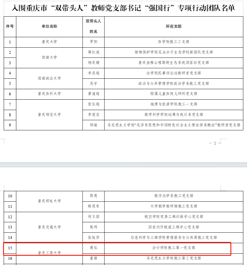 近日,中共重庆市委教育工作委员会公布了重庆市“双带头人”教师党支部书记“强国行”专项行动团队名单,我院教工第一党支部成功入选(“双带头人”教师党支部书记蒋弘)。