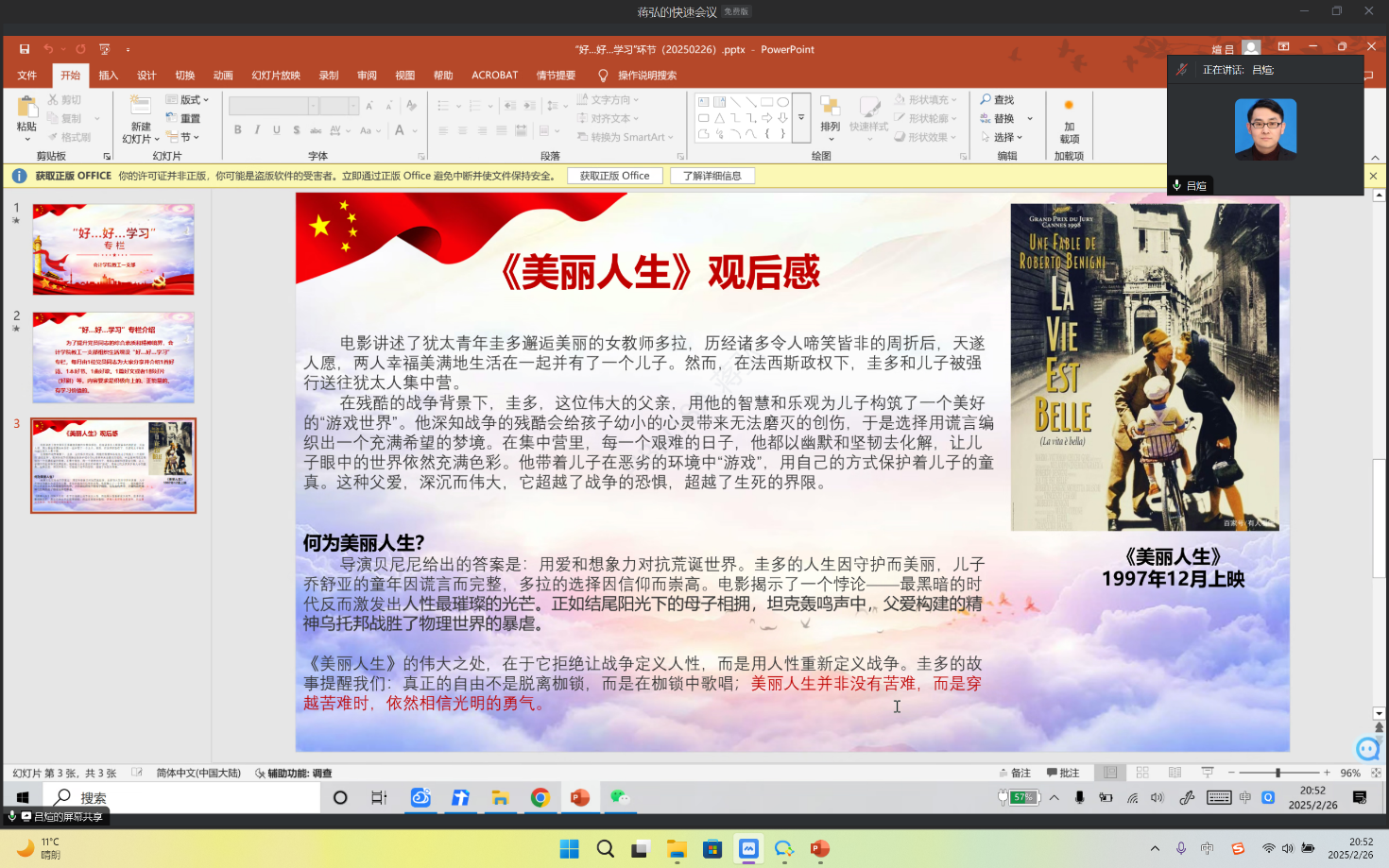 在随后的“好……好……学习”环节,吕煊同志分享了一部二战题材电影——《美丽人生》。该影片生动讲述了一名父亲如何在法西斯集中营的残酷环境下,用爱和想象力为儿子构建一个充满希望的“游戏世界”、保护孩子的童真与纯洁的故事。吕煊认为,在最黑暗的时代,人性的光芒依然能够闪耀,真正的美丽人生不是没有苦难,而是在苦难中依然保持对光明的信念。