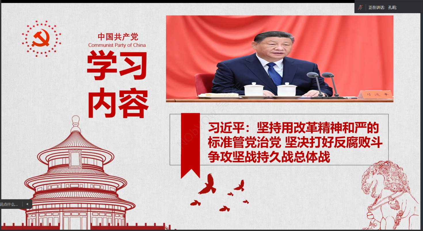 首先,组织委员孔莉领学了“习近平总书记在二十届中央纪委四次全会上的重要讲话精神”。习近平总书记的讲话充分肯定了过去一年全面从严治党取得的新进展新成效,并从实现新时代新征程党的使命任务的战略高度,以高远的历史眼光深刻把握了反腐败斗争基本规律,深刻分析了当前反腐败斗争形势,旗帜鲜明地澄清错误认识、廓清思想迷雾,对坚决打好反腐败斗争攻坚战、持久战、总体战提出了明确要求,对以全面从严治党新成效为推进中国式现代化提供坚强保障作出了战略部署,也对纪检监察干部队伍寄予了殷切期望。孔莉在领学中以统计数据向大家展示了我党在2024年反腐败斗争中取得的成果,并强调“全面从严治党永远在路上”的重要性。她认为,各位支部党员应该深入学习贯彻习近平总书记的重要讲话精神,坚定信心、敢于斗争,认真履行全面从严治党政治责任,从身边事做起,从身边人管起,不以善小而不为,不以恶小而为之,坚定不移把反腐败斗争向纵深推进。